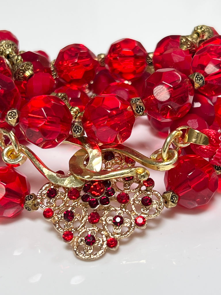 Make a bold, timeless statement with this vibrant collection. The striking red crystal brooch gleams with rich, faceted detailing that catches the light beautifully, adding elegance to any outfit. Paired with a trio of stacking bracelets, each crafted from deep, faceted red crystals, the set layers effortlessly for a look that’ s both chic and powerful. Wear them together for maximum impact, or mix and match to suit your style either way, you will shine with classic sophistication and modern flair.